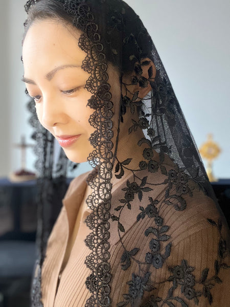 This beautiful D mantilla is dedicated to the well-loved Pope St. John Paul the Great. It is made from a soft embroidered black tulle and finished with an elegant black Guipure lace trim.